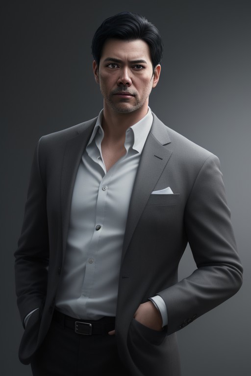 best quality,masterpiece,(realistic:1.2)quality,realistic,masterpiece,Highly detailed,1boy,office man,adult,asian,black hair,suit,standing,hand in pocket,grey_background,moody lighting,full_shot,frontlight,highres,absurdres,incredibly_absurdres,huge_filesize,