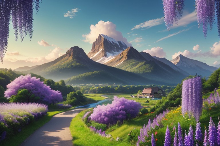(masterpiece,best quality) PC Wallpaper, Mountain Scenery, High Detail, 4K, Daytime, green valley, spring, blue_sky, building, bush, city, cloud, cloudy_sky, day, field, flower, flower_field, forest, grass, hill, horizon, landscape, mountain, mountainous_horizon, nature, no_humans, ocean, outdoors, path, river, road, scenery, sky, afternoon, tree, water, wisteria, purple flower, eastern landscape, snowy mountain
