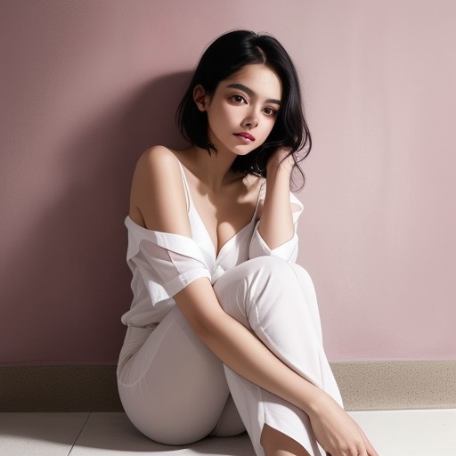 A stunning young woman with short, sleek black hair and mesmerizing brown eyes sits against a deep pink wall, bathed in moody, cinematic lighting. She wears an unbuttoned silky white shirt that drapes off her shoulders, revealing smooth, flawless skin and an alluring figure. Her expression is soft yet captivating, with a hint of playful confidence as she gently touches her hair. The lighting is a dramatic blend of deep magenta and soft neon white, casting a sensual glow on her curves and creating striking highlights on the glossy fabric. Her posture is relaxed, one leg bent and arms resting gracefully on the floor. The background consists of a bold pink wall with a strong light beam cutting through the scene, adding depth and intensity. The atmosphere is intimate, stylish, and evocative, with a balance of warmth and contrast.