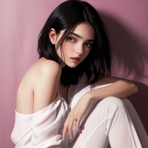 A stunning young woman with short, sleek black hair and mesmerizing brown eyes sits against a deep pink wall, bathed in moody, cinematic lighting. She wears an unbuttoned silky white shirt that drapes off her shoulders, revealing smooth, flawless skin and an alluring figure. Her expression is soft yet captivating, with a hint of playful confidence as she gently touches her hair. The lighting is a dramatic blend of deep magenta and soft neon white, casting a sensual glow on her curves and creating striking highlights on the glossy fabric. Her posture is relaxed, one leg bent and arms resting gracefully on the floor. The background consists of a bold pink wall with a strong light beam cutting through the scene, adding depth and intensity. The atmosphere is intimate, stylish, and evocative, with a balance of warmth and contrast.