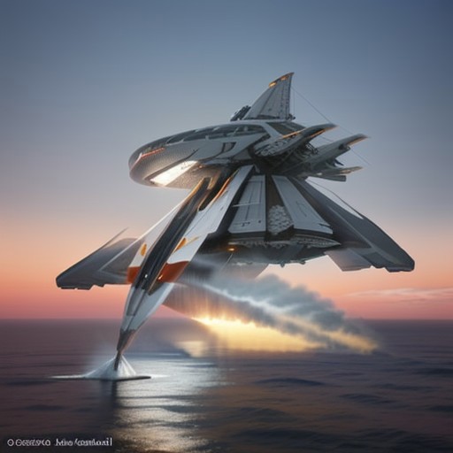 side view, Flying right above the ocean’s surface with a (((spume spindrift of water))) a pilot flying a (((futuristic spaceship))) with the aerodynamic (((chassis in the shape of a plaice))), (((surrounded by a force shield))), intricate technical details, ethereal glow, against a backdrop of white cliffs during sunset, color photograph