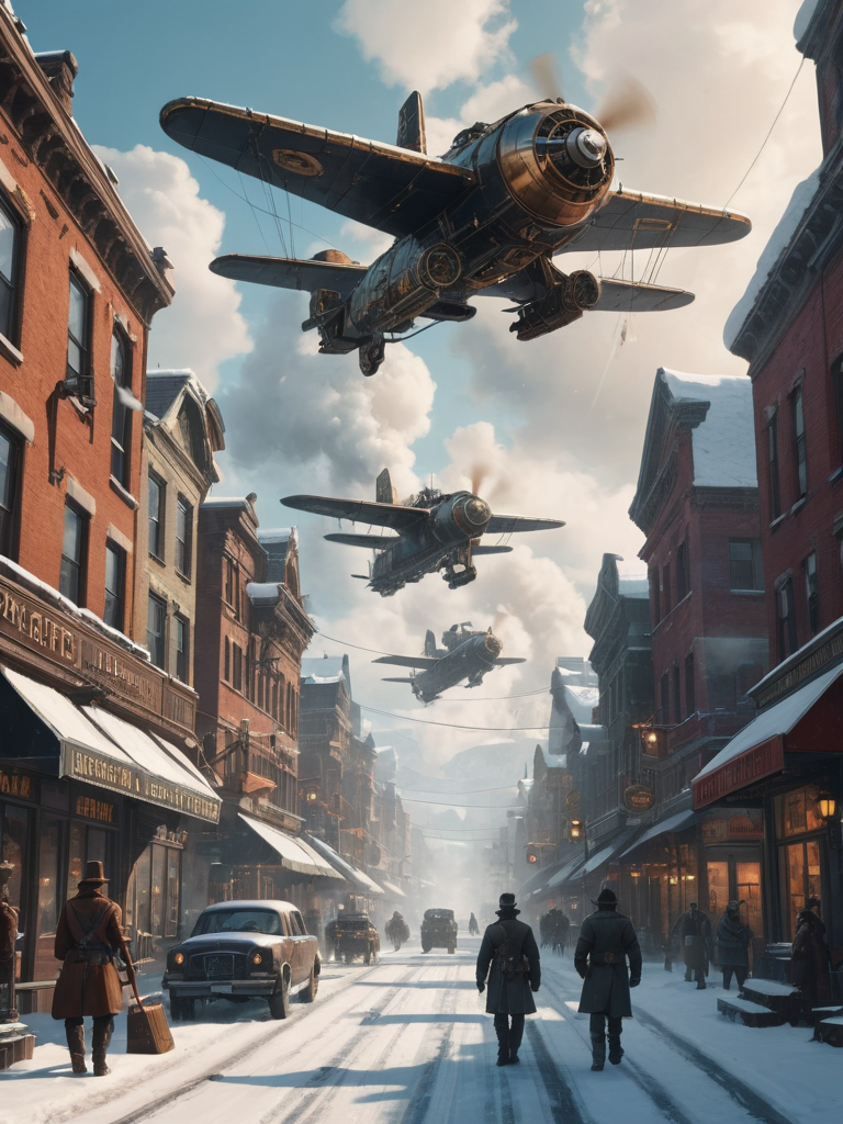 a steampunk world, cyberpunk planes flying,, street, steam punk robots, snow, canada, northern canada, afternoon, illustracion, 4k, masterplace, 90's style