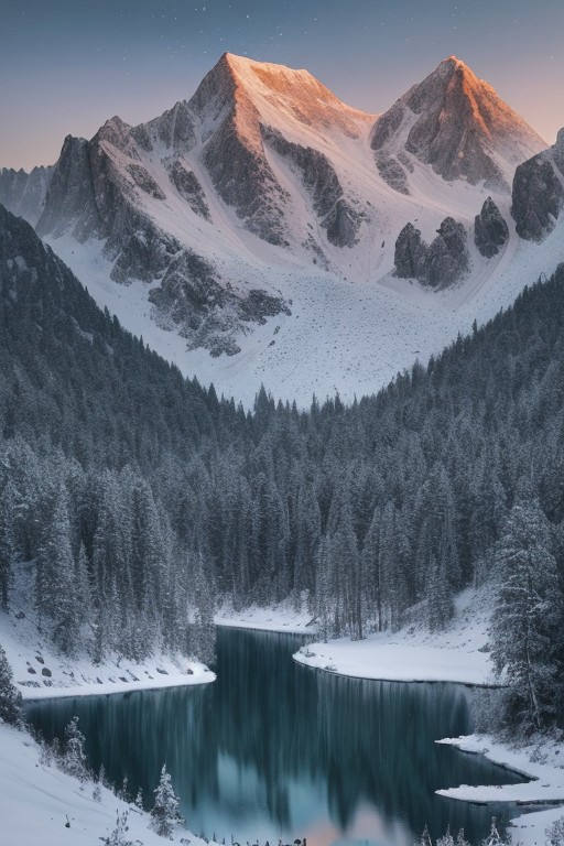 Masterpiece, high-resolution, grainy image, tall mountains, pine forest, lake, snow, galaxy, mountain trail
