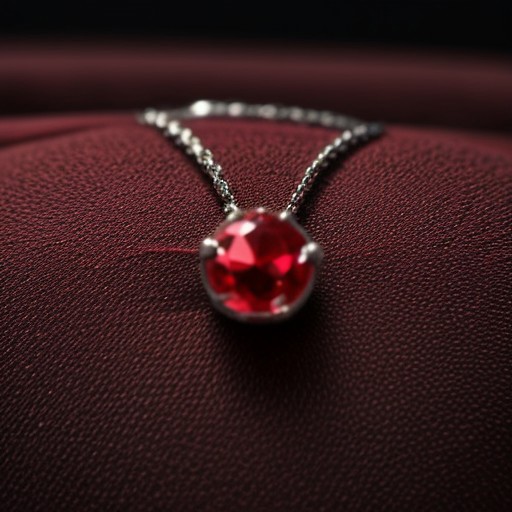 score_9, score_8_up, close up photography, an elegant silver necklace with ruby gemstones displayed on top of a wrinkled red velvet cloth on a weathered stone surface, dark background, blurred background
