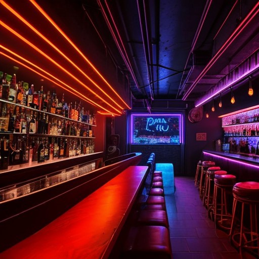A bar with the name CHUMA in neon light in A futuristic cyberpunk city at night the are bright City light in different colors