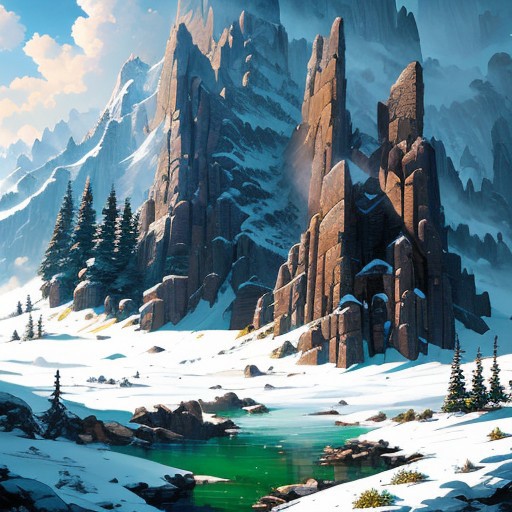 RAW photo, (masterpiece:1.3), subsurface scattering, heavy shadow, (high quality:1.4), (intricate, high detail:1.2), professional color photography, HDR, High Dynamic Range, realistic, ultra realistic, photorealistic, high resolution, film photography, ambient lighting, atmospheric effects, <lora:detail_slider_v4:2>, OverallDetail, <lora:storybook_last:1>, <lora:FantasyMountains:1>,arch, architecture, bird, building, cliff, cloud, cloudy sky, dark, day, fanmou, fog, forest, from behind, grass, house, landscape, mountain, mountainous horizon, nature, no humans, outdoors, painting \(medium\), pine tree, reflection, river, road, rock, ruins, scenery, sky, snow, solo, stream, tree, wide shot
