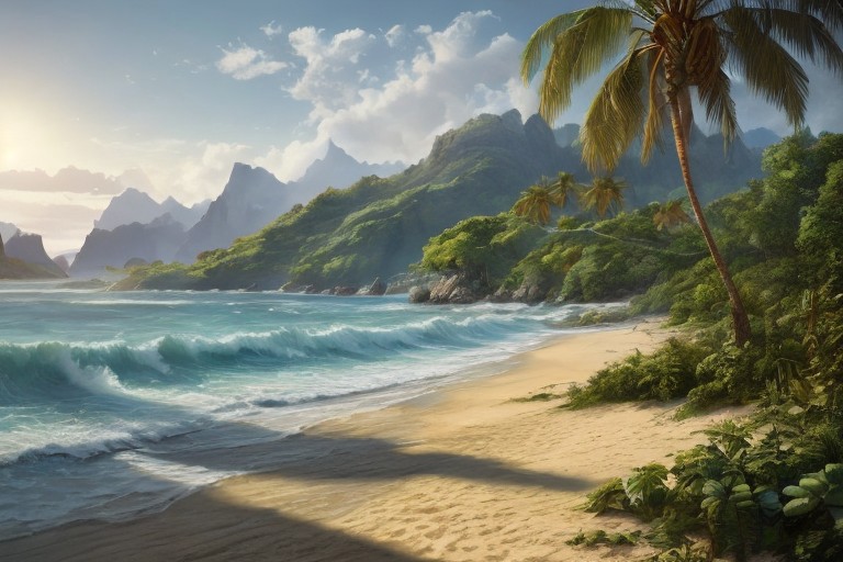 RAW photo, (masterpiece:1.3), subsurface scattering, heavy shadow, (high quality:1.4), (intricate, high detail:1.2), professional photography, HDR, High Dynamic Range, realistic, ultra realistic, photorealistic, high resolution, film photography, ambient lighting, atmospheric effects, <lora:detail_slider_v4:2>, OverallDetail, <lora:Beach:1>, beach, cloud, cloudy sky, nature, no humans, palm tree, plant, rock, scenery, shore, sky, summer, sunlight, tree, mountains in the background, epiCPhoto