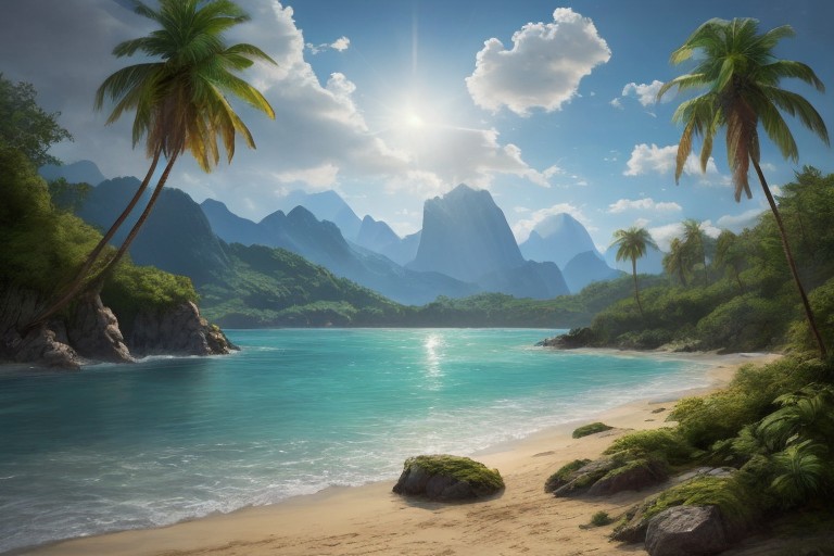 RAW photo, (masterpiece:1.3), subsurface scattering, heavy shadow, (high quality:1.4), (intricate, high detail:1.2), professional photography, HDR, High Dynamic Range, realistic, ultra realistic, photorealistic, high resolution, film photography, ambient lighting, atmospheric effects, <lora:detail_slider_v4:2>, OverallDetail, <lora:Beach:1>, beach, cloud, cloudy sky, nature, no humans, palm tree, plant, rock, scenery, shore, sky, summer, sunlight, tree, mountains in the background, epiCPhoto