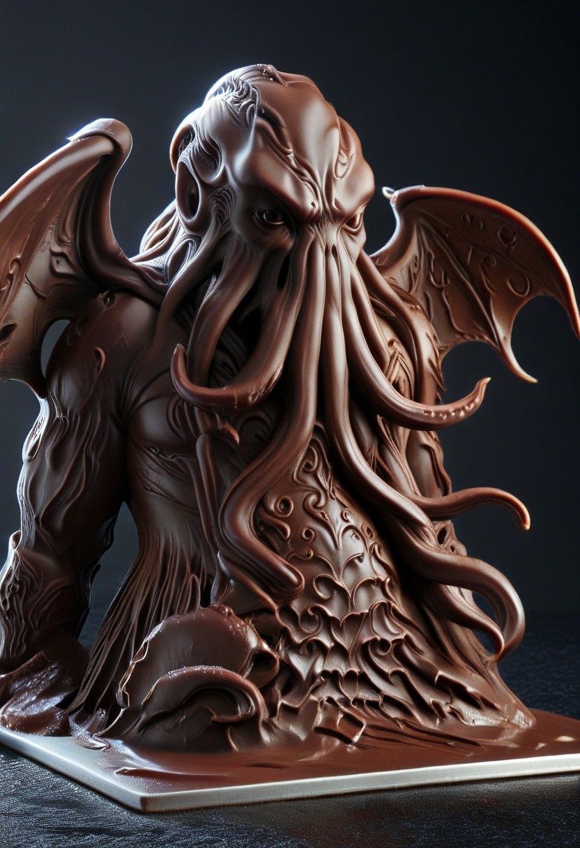 masterpiece , photography, RAW , ultra HD, chocolate art, cthulhu, dark chocolat, cthulhu Made of chocolate,