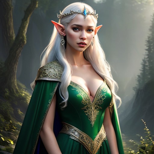 RAW photo, (masterpiece:1.3), subsurface scattering, heavy shadow, (high quality:1.4), (intricate, high detail:1.2), professional photography, HDR, High Dynamic Range, realistic, ultra realistic, photorealistic, high resolution, film photography, ambient lighting, atmospheric effects, <lora:detail_slider_v4:2>, OverallDetail, <lora:ElfQueen:0.7>, 1girl, blurry background, breasts, cleavage, dress, earrings, elf, elfqueen, cape, green dress, lips, long hair, looking at viewer, nature, pointy ears, solo, tiara, white hair