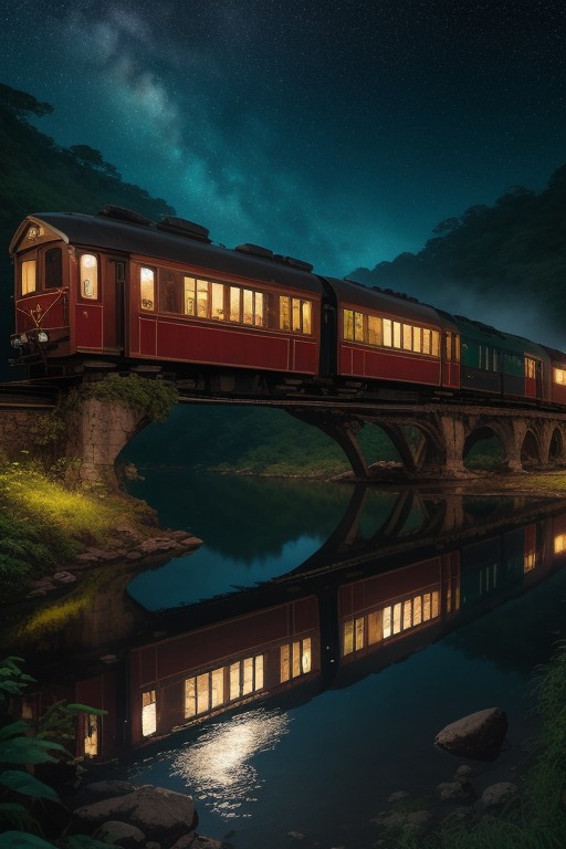 masterpiece, ultra photorealistic, 64k UHD, vivid colors, sharp focus, enchanting moonrays, crystal blue water reflecting moonlight, starry sky, pristine vegetation, majestic jungle lake and winding river, desolate atmosphere at night, a glowing vintage train passing over an ancient bridge, ultra-detailed textures, cinematic composition,