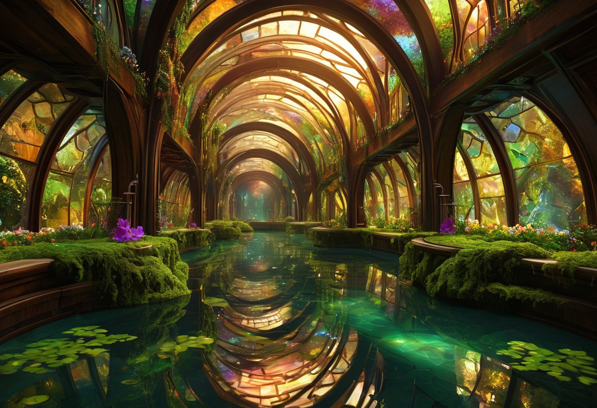 (masterpiece:1.5), unreal 8k wallpaper, unity 8k wallpaper, score 9, score 8 up, score 7 up, masterpiece_portrait, extreme quality, reflection, surface reflection, dynamic lighting, Cinematic style, cinematic quality, ((no humans, no people)), photorealistic, realistic, a spectrum of iridescent colors, precise, fractal design, flowing curves, precision, colorful, fractal geometry, harmonic interference, digital illustration, photo manipulation, altered realities, fantastical scenes, digital artistry, striking visuals, sharp focus, detailed background, light reflection, fantasy of boundless opportunities and architecture, (A ancient floating sanctuary, wooden bridges covered in wild moss and glowing Vines, beautiful and magnificent hanging floral garden, on the ceiling is an huge Platinum astrolabe that tracks the movement of distant galaxies, its gears shifting with an ethereal light, circular pools filled with fish reflecting constellations unseen, shimmer beneath floating platforms covered in multicolored flowers and ferns, the platforms and walkways are made with an elegant beauty, a strange and magnificent Lord of the rings designs, there is a mysterious ancient magic that lives here, fluid architecture, sunset, ancient fantasy realm, the ceiling is made completely of glass and elegant Platinum, circular architecture), (made of metal, glass and exotic woods), (inspired by Lord of the rings), luminescent water,