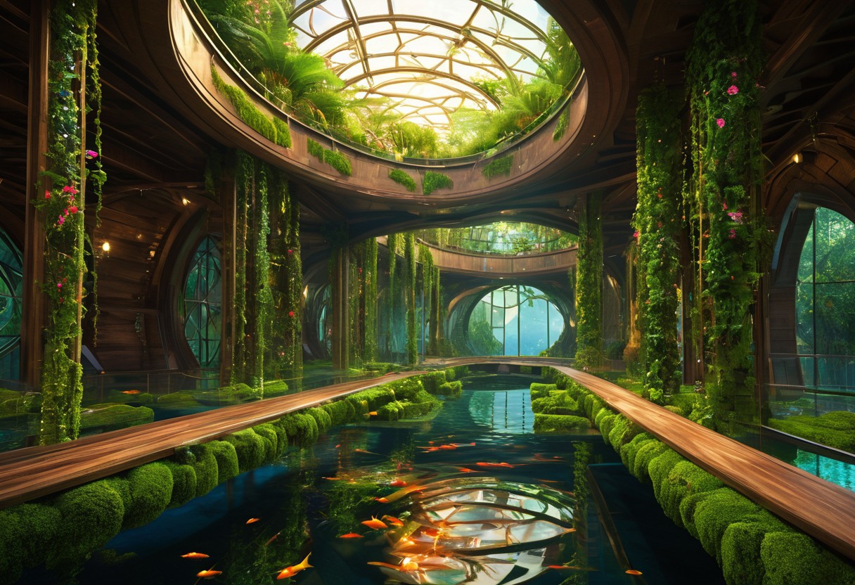 (masterpiece:1.5), unreal 8k wallpaper, unity 8k wallpaper, score 9, score 8 up, score 7 up, masterpiece_portrait, extreme quality, reflection, surface reflection, dynamic lighting, Cinematic style, cinematic quality, ((no humans, no people)), photorealistic, realistic, a spectrum of iridescent colors, precise, fractal design, flowing curves, precision, colorful, fractal geometry, harmonic interference, digital illustration, photo manipulation, altered realities, fantastical scenes, digital artistry, striking visuals, sharp focus, detailed background, light reflection, fantasy of boundless opportunities and architecture, (A ancient floating sanctuary, wooden bridges covered in wild moss and glowing Vines, beautiful and magnificent hanging floral garden, on the ceiling is an huge Platinum astrolabe that tracks the movement of distant galaxies, its gears shifting with an ethereal light, circular pools filled with fish reflecting constellations unseen, shimmer beneath floating platforms covered in multicolored flowers and ferns, the platforms and walkways are made with an elegant beauty, a strange and magnificent Lord of the rings designs, there is a mysterious ancient magic that lives here, fluid architecture, sunset, ancient fantasy realm, the ceiling is made completely of glass and elegant Platinum, circular architecture), (made of metal, glass and exotic woods), (inspired by Lord of the rings), luminescent water,