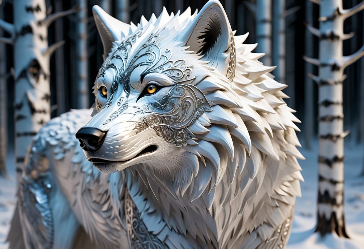 lazypos Here's a wild take on this majestic white wolf made of l1qu1dp34rl, metal, pearlescent, grey and white, and a pinch of fantasy art. The snowy forest background, with its shimmering aurora borealis, adds a touch of realism, while the wolf's intricate tattoo-like patterns of metal bring in an ornamental art vibe.