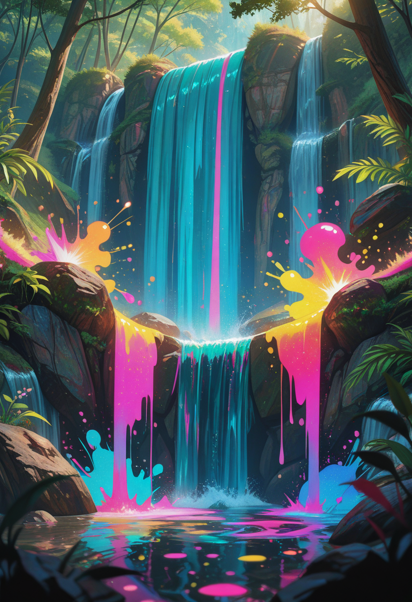 best quality, masterpiece, absurdres, newest, highly detailed, (official style 1.1), no humans, <lora:incs:1> reij-incs, color splash effect, neon colors, black ink, flowing water, waterfall, nature, landscape portrait,